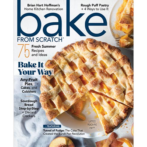 It’s the season of fun and fantastic flavors with this July/August issue of Bake from Scratch! Delve into our From the Test Kitchen feature to get to know your stand mixer better, including speeds, attachments, and so much more. Flip to Baker Spotlight to discover home baker-turned-professional Mindy Flack and then to Baker Profile feature, where Jack Hazan, author of Mind Over Batter, shares how baking can be a form of therapy. We give you a look into editor-in-chief Brian Hart Hoffman’s kitchen built to be a baker’s dream. But the fun doesn’t stop there! We share an incredible Caprese Pull-Apart Bread and a delicious Gluten-Free Focaccia in our Bread Box feature and break down the how-tos of sourdough in The Essential. From easy-to-achieve rough puff to confections filled with your choice of fruit to the best crackers for charcuterie boards, this issue features recipes for everyone! Finally, discover the enticing history of the Tunnel of Fudge, a cake with a story as sweet as its ingredients, and Brian’s Aunt Cheryl’s Home Ec Muffins that show how simple can taste better. Filled with sweets, recipes, and incredible stories, this issue is one you don’t want to miss!