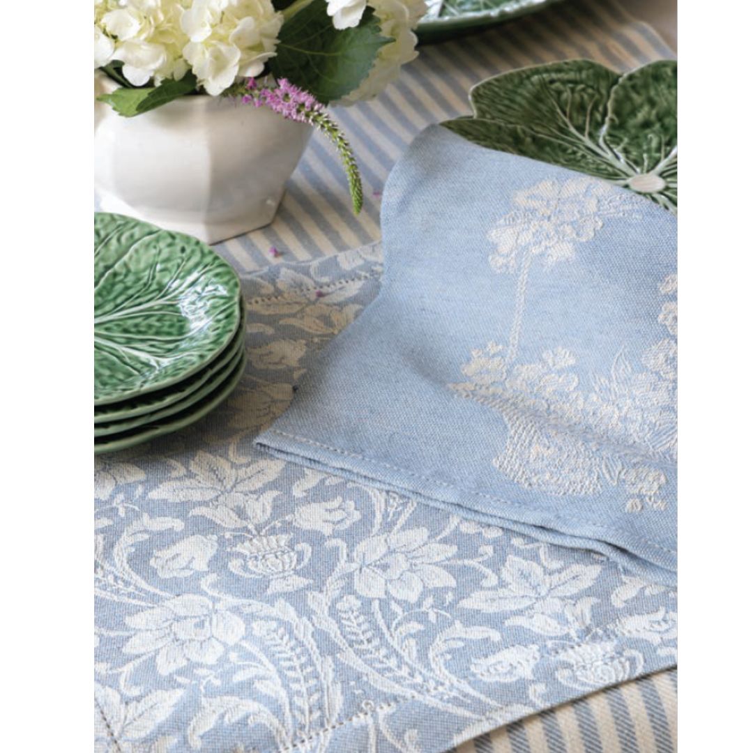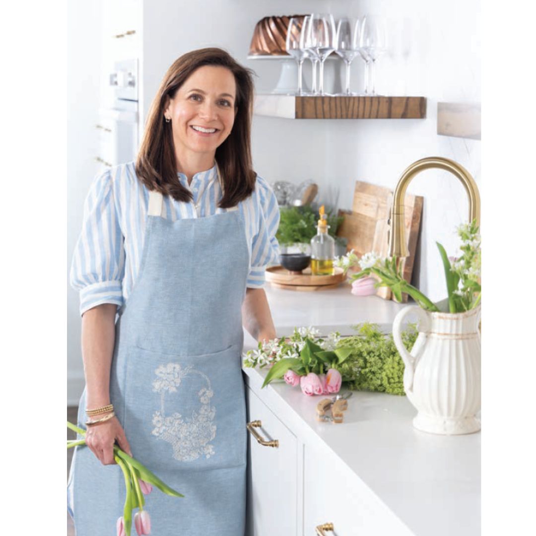 As featured in Victoria Magazine, Tuscany-based textiles brand Busatti boasts timeless design and impeccable quality, as well as an impressive family story woven over eight generations. This array of linens, selected by our senior director of design, Melissa Sturdivant Smith, evokes all the finery of a Mediterranean holiday. The Busatti Apron features a charming floral basket motif exclusive to Victoria, while shades of cream and white dance atop offerings of blue.