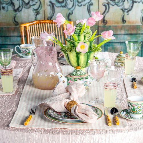 Featuring a delicate floral basket motif, the Briscola Raso Napkin is offered in a soft pale pink, a color and pattern exclusive to Southern Lady. Complementing this stunning piece are additional tabletop essentials in serene shades of pink and cream, including Donna di Coppe napkins, place mats, and a striped Pomelo table runner—each thoughtfully crafted for refined entertaining.
