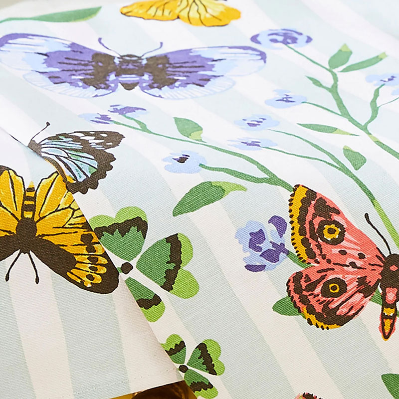 Butterfly Grove is a joyful celebration of colour, nature, and vintage charm. Inspired by antique butterfly illustrations, this heirloom-quality design features hand-painted watercolour artwork that brings delicate meadow flowers and vibrant butterflies to life with exquisite detail. Set against soft cream and pale blue backgrounds, the bright hues of the butterflies and blossoms truly shine creating a striking contrast that feels both fresh and nostalgic. Placement prints on graphic stripe backgrounds add a contemporary twist, balancing the romantic florals with a touch of modern structure. Lush green foliage winds through the design, evoking the feel of a secret garden or a summer meadow in full bloom. Perfect for those who appreciate beauty in the details, Butterfly Grove is where vintage elegance meets playful colour in a timeless, painterly composition.