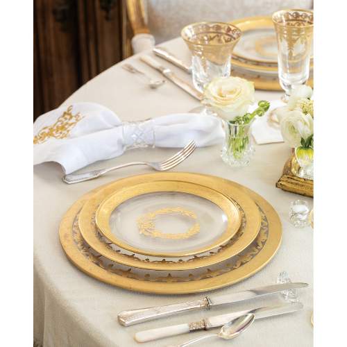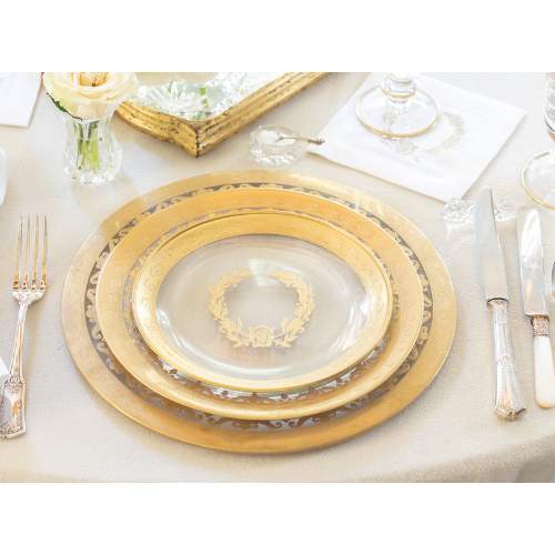 Etched by hand and accented with resplendent 24-karat gold flourishes, these gorgeous glass plates add a touch of opulence to any affair. Designed with careful attention to detail and fashioned with exceptional artistry, the Victoria X Arte Italica Laurel Wreath Salad Plate is sure to become a treasured item in your tableware collection and can be passed on to future generations.