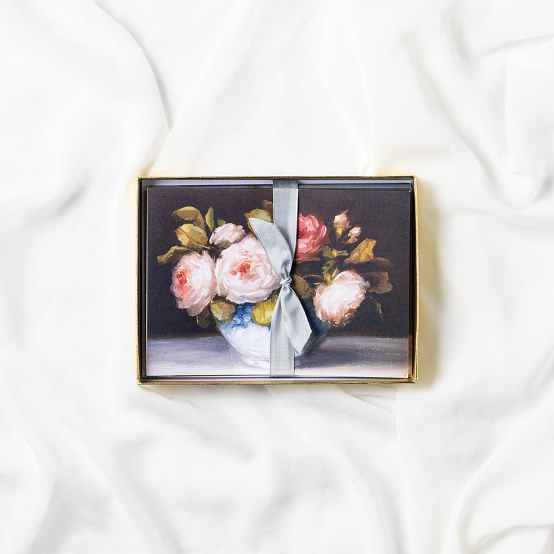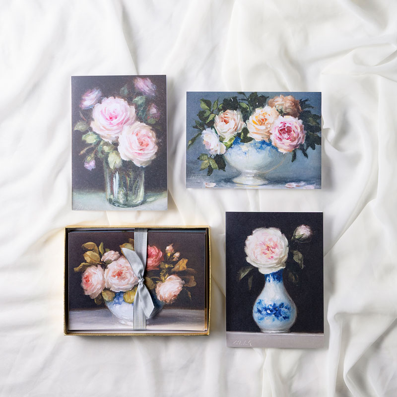 Each set includes 10 blank note cards showcasing Carolina’s luminous rose paintings, printed on luxurious 100# opaque bright white cover paper that beautifully renders every delicate petal and subtle shade. The cards arrive thoughtfully tied with elegant ribbon and nestled in a golden keepsake box, making this collection as delightful to give as it is to own.